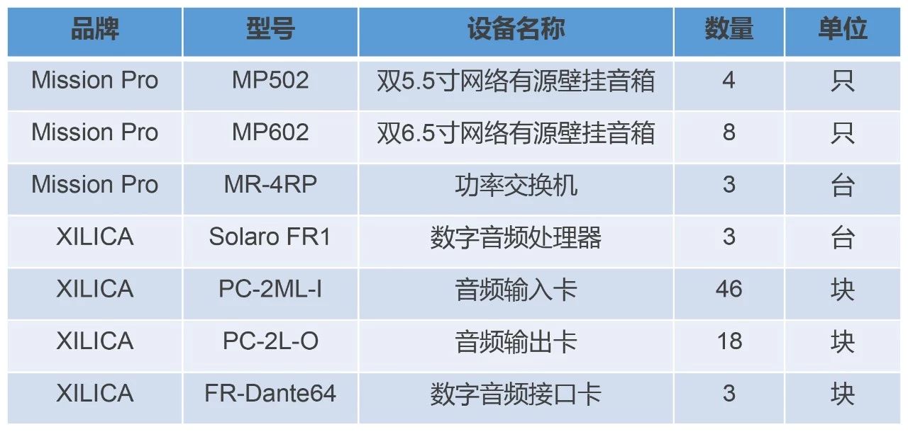 考慮到該項目的實際需求,前期結合工程圖紙與項目方進行了充分溝通,通過與同類產(chǎn)品的多次對比、多次測試,最終選擇了先歌國際旗下?lián)碛?0多年先進技術經(jīng)驗的英國知名音響品牌——Mission Pro美聲網(wǎng)絡音頻系列產(chǎn)品,以及專業(yè)從事設計、研發(fā)和生產(chǎn)高性能DSP音頻處理系統(tǒng)17載的國際知名品牌——加拿大XILICA Solaro FR1高端數(shù)字音頻處理系統(tǒng)。