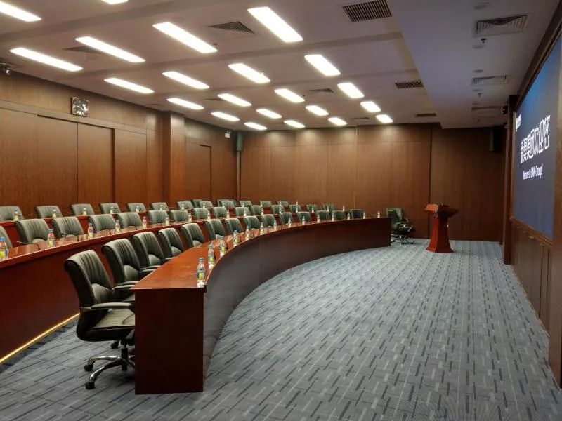 大績效會議室長14.56m、寬6.8m、高3.5m,面積約99㎡,可容納坐席52個,主要用于產(chǎn)業(yè)集團績效回顧會、集團大會主會場等會議場景。