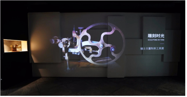其中“五聯(lián)屏時空穿越廳”,展現(xiàn)穿梭時空的震撼,引出時間的產(chǎn)生與意義。通過上下三臺CB-L1060投影鐘表的鏈條,展示飛亞達表的文化和歷史。利用佳能投影機獨有的自帶0.54:1的鏡頭,通過有限的空間,展示出大畫面和細膩的圖像,還原飛亞達的鐘表歷史,詮釋出歷史與未來的演變。