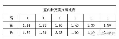為避免以上聲學缺陷的產生,可以由前述所知,規則的體型容易在室內造成聲學缺陷。尤其是空間的長寬高比例是整數比的情況下。因此可在空間體型設計之初,確定室內空間大小時調整長寬高的比例。理想的長寬高比例是1:21/2:21/3,通常建筑設計條件很難滿足理想比例,以下表中的推薦比例可作為設計初期的參考。