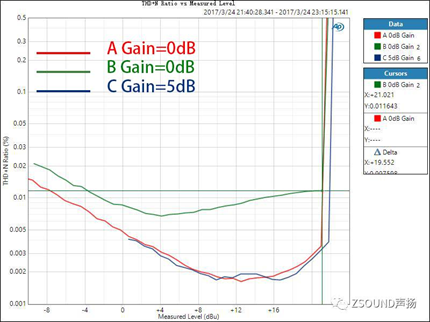 對(duì)于數(shù)字調(diào)音臺(tái),我們不僅要關(guān)心話放增益在0dB時(shí)的THD+N比率,還需要了解到,話放增益在不同位置時(shí)的情況,因?yàn)檫@是使用中的實(shí)際情形。話放的增益在不同大小時(shí),其引入的噪音和失真也是不同的,了解這一點(diǎn)對(duì)于用戶正確設(shè)置增益也很有參考意義。