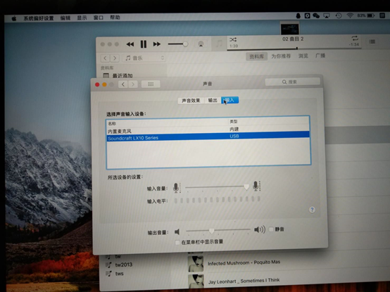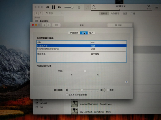 圖20:這里用的是OS系統(tǒng)自帶播放器,有些播放器可能需要在軟件本身再做一次聲卡輸出的選擇。另WIN系統(tǒng)也一樣要先把系統(tǒng)聲音輸入輸出選項(xiàng)有電腦本身?yè)P(yáng)聲器改為L(zhǎng)X10調(diào)音臺(tái)聲卡;低版本的WIN系統(tǒng)有可能還需要安裝LX10聲卡驅(qū)動(dòng)。