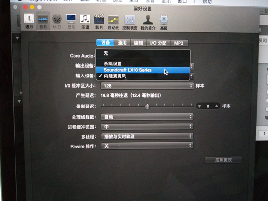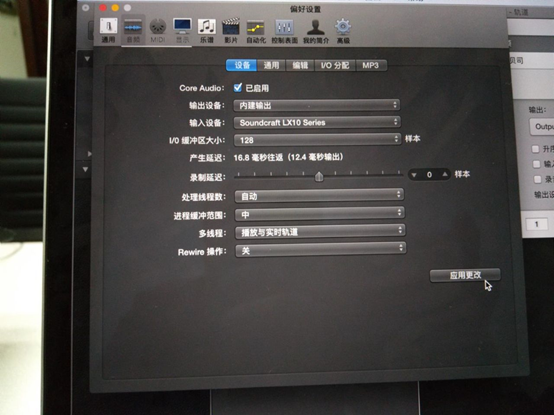 圖26:改好以后需點(diǎn)擊應(yīng)用更改,使更改生效。如果你要用此軟件進(jìn)行錄音回放,那么你的輸出設(shè)備也應(yīng)改為調(diào)音臺(tái)輸出。我這里沒用到就沒做更改。