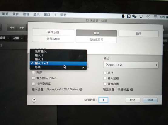 圖27:設(shè)備選擇好后選擇輸入通道,可以選擇單通道(這樣的話就要建兩個(gè)軌道)這里選擇的是1+2模式一個(gè)軌道錄制立體聲。選擇好后入圖28所示。