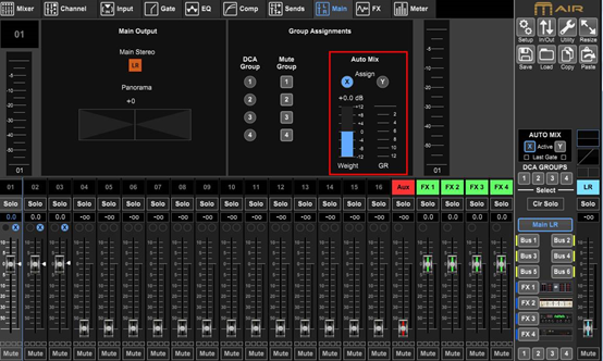 這里的AUTO MIX可分為兩組,分別為X和Y,還有一個AUTO Weight(自動優先級的量)可進行調整,還有一個GR電平表可觀察到每個通道分享增益量的大小。