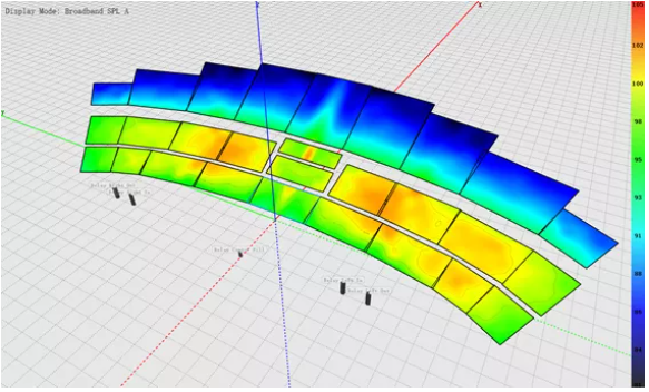 當(dāng)陣列的模塊之間不再存在物理夾角的制約,很多問題都迎刃而解。對于傳統(tǒng)線陣列來說,陣列吊裝位置和觀眾席之間的關(guān)系是十分重要的,尤其是垂直位置較高的觀眾席,需要陣列頂部的高度盡可能地高,這樣才能夠?qū)⒛芰坑行У赝渡溥^去。如果吊裝條件無法滿足,則需要陣列呈現(xiàn)出非常極端的姿態(tài)才有可能達(dá)到近似的效果。