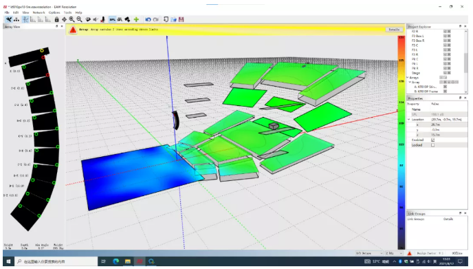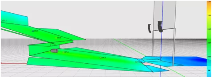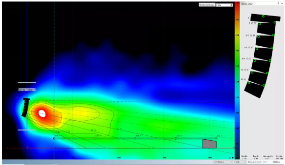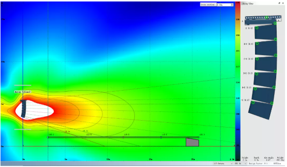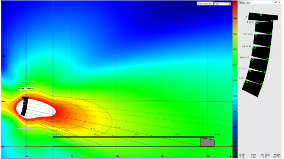 我們可以看到,為了獲得較為滿意的覆蓋結(jié)果,傳統(tǒng)線陣列在吊點高度不足時必須以接近極限的物理姿態(tài)來進行安裝。請注意最上面2顆音箱的快插銷已經(jīng)出現(xiàn)了載荷警報,呈現(xiàn)紅色。在實際項目中如果遇到此類情況,就不得不在吊裝位置和覆蓋效果之間做出妥協(xié)。