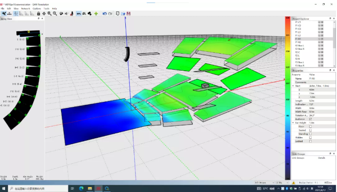 但在實際系統(tǒng)實施的過程中,吊掛高度很可能受限。因此第二張圖展示了同樣的陣列在吊掛高度為9米時的覆蓋情況,通過調(diào)整陣列物理姿態(tài)獲得了與第一張圖非常接近的覆蓋結(jié)果。