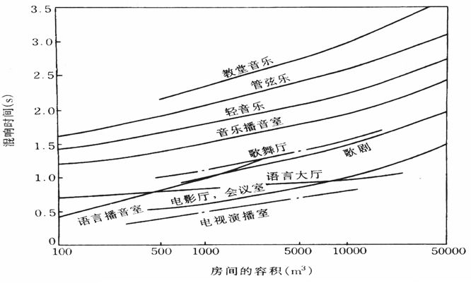 對于不同類型的音響工程,混響時間的要求有所不同;同類型的工程,不同的聲場大小,混響時間的指標也有不同。一般來講,我們可以在500Hz和1000Hz兩個地方計算聲場的混響時間。