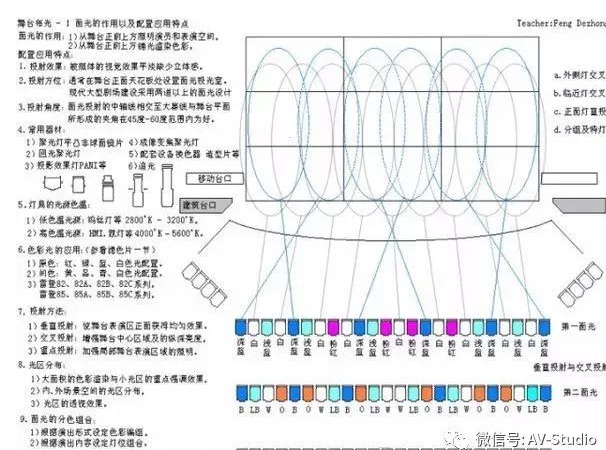 1、面光:自觀眾頂部正面投向舞臺的光,主要作用為人物正面照明及整臺基本光鋪染。