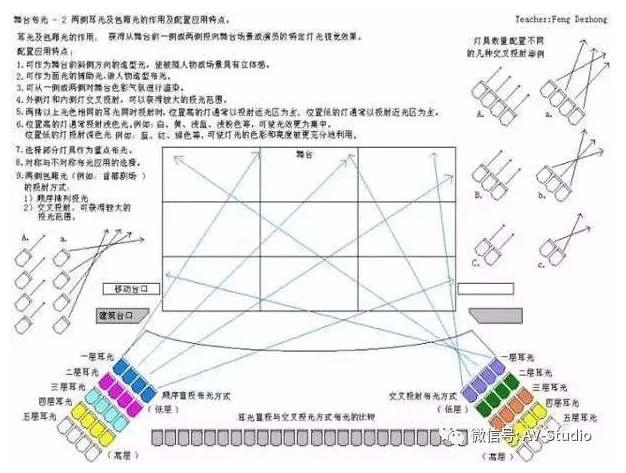2、耳光:位于臺口外兩側,斜投于舞臺的光,分為上下數(shù)層,主要輔助面光,加強面部照明,增加人物、景物立體感。