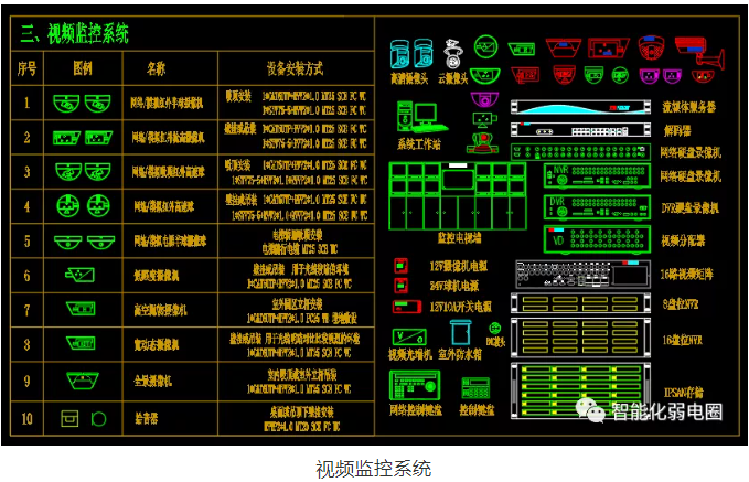 視頻監(jiān)控系統(tǒng)是智能化l弱電系統(tǒng)最常用的系統(tǒng)之一,整套系統(tǒng)包括前端攝像頭,線纜,交換機(jī),存儲(chǔ),解碼,大屏等設(shè)備組成,視頻監(jiān)控系統(tǒng)涉及到的弱電設(shè)計(jì)圖標(biāo)主要有半球攝像機(jī),球機(jī),槍機(jī),全景攝像頭,高考拋物攝頭,NVR,IPSAN,矩陣,流媒體服務(wù)器,解碼器,電腦終端,開(kāi)關(guān)電源等等。