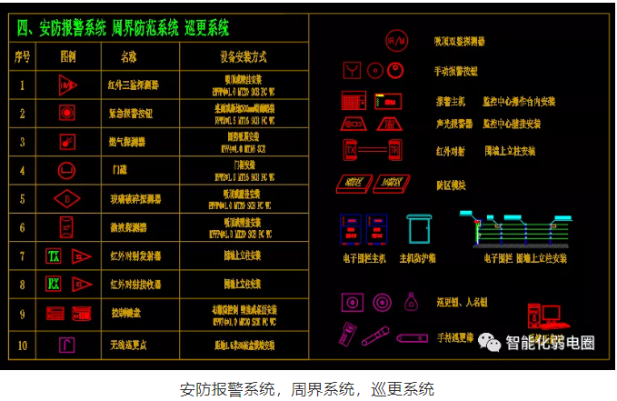安防報(bào)警、周界防范、巡更系統(tǒng)弱電設(shè)計(jì)圖標(biāo)主要有紅外探測(cè)器,緊急報(bào)警按鈕,燃?xì)馓綔y(cè)器,門(mén)磁,紅外對(duì)射,無(wú)線巡更點(diǎn)等等。