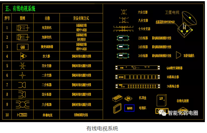 有線電視系統(tǒng)弱電設(shè)計(jì)圖標(biāo)主要有光發(fā)射機(jī),光接收機(jī),放大器,分支器,分配器等組成。