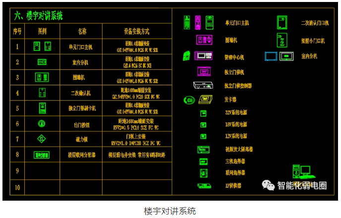 樓宇對(duì)講系統(tǒng)弱電設(shè)計(jì)圖標(biāo)主要有單元門(mén)口主機(jī)、室內(nèi)分機(jī)、圍墻機(jī)、出門(mén)按鈕、磁力鎖,管理中心機(jī),門(mén)禁控制器等組成。