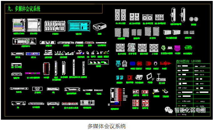 多媒體會(huì)議系統(tǒng)弱電設(shè)計(jì)圖標(biāo)主要調(diào)音臺(tái),燈光調(diào)光臺(tái),投影機(jī),功率放大器,專業(yè)音頻播放器,會(huì)議主機(jī),無(wú)線手持話筒等組成。