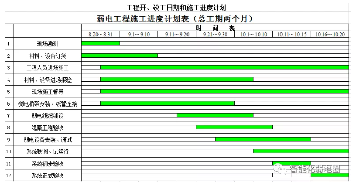 工程進度計劃表:制定工期進度計劃表,分為項目準備、施工深化設計、設備線材采購、管線施工、設備安裝、系統調試、系統培訓、資料整理等階段,做好工期進度安排。