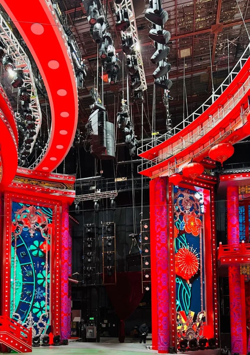 此次遼視春晚舞美設計較為復雜,舞臺頂部使用了喜慶的中式風格,有中式建筑的頂部橫梁,還懸掛有多只大紅燈籠。為滿足拍攝的美觀需求,曾多次調整主擴系統的吊裝高度和位置,最終主系統被吊掛在舞臺兩側上空10.5米的高度,隱藏在中式風格弧型橫梁的后部,毫無違和感。