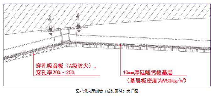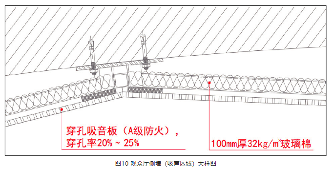 3) 側(cè)墻中段內(nèi)凹區(qū)域(圖4玫紅色墻面),2 m 以下人員活動高度范圍內(nèi)(圖9),保留裝飾做法,做強(qiáng)吸聲處理,避免聲聚焦。穿孔吸音板穿孔率20%~25%,板后應(yīng)形成封閉空腔,空腔內(nèi)填100 mm厚32 kg/m3玻璃棉,見圖9、圖10。側(cè)墻吸聲區(qū)域與非吸聲區(qū)域裝飾效果保持統(tǒng)一。