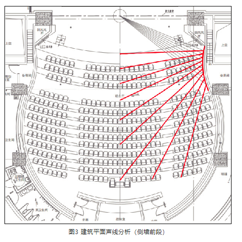 從圖5可以看出,吊頂反射聲分布均勻,能覆蓋全部觀眾席。但存在如下問題:部分聲線反射至臺唇和觀眾廳后墻,這部分反射聲未能有效利用。且反射回臺唇的聲音可能形成回聲。