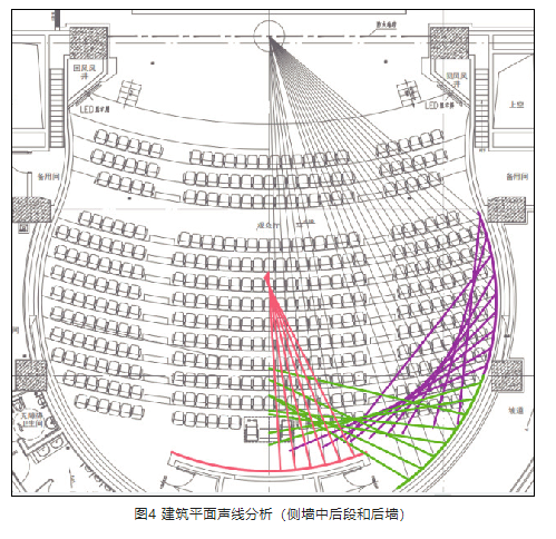 5) 側(cè)墻后段內(nèi)凹區(qū)域(圖4綠色色墻面)聲聚焦程度較弱,且聚焦點(diǎn)不在觀眾席。該區(qū)域如果做吸聲處理,會導(dǎo)致廳內(nèi)吸聲過量;如果做擴(kuò)散處理,與側(cè)墻其他區(qū)域裝飾風(fēng)格不統(tǒng)一,略顯突兀。因此,側(cè)墻后部內(nèi)凹區(qū)域未做處理。