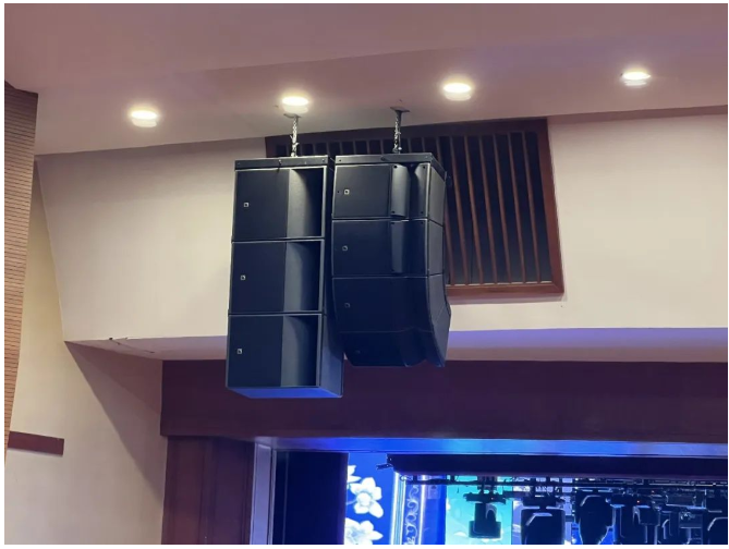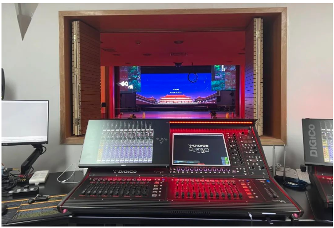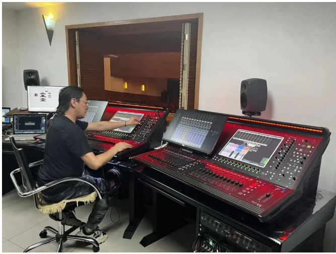 主擴(kuò)使用L-Acoustics A15i(A15i Foucs、A15i Wide)。A15i擁有Panflex技術(shù),可在現(xiàn)場很直觀地調(diào)節(jié)好音箱的聲輻射方向,保證觀眾席各個區(qū)域內(nèi)都可獲得較為均勻的直達(dá)聲,精準(zhǔn)的角度投射有利于實現(xiàn)聲場的全覆蓋;低頻音箱使用KS21i,擴(kuò)展低頻下限。 主擴(kuò)系統(tǒng)明裝線陣列吊掛置舞臺上方,明裝吊掛使聲音不受阻擋,能大幅度減少對聲能的損失并提高清晰度。且A15i外觀干凈整潔符合場地的審美需求,是聽覺效果和視覺效果的最佳解決方案。 補(bǔ)聲和返送系統(tǒng)選擇X12多功能同軸系統(tǒng)揚聲器。擁有90°x60°橢形指向性,可根據(jù)現(xiàn)場聽音需求進(jìn)行調(diào)整,確保獲得最真實的聽感。 臺唇比較靠近觀眾區(qū)域,選擇小巧的5XT揚聲器補(bǔ)充前排觀眾的聲音能量,有效避免對觀眾視覺體驗造成影響。另外,臺唇高度的設(shè)置也十分合理,恰好高于桌子避免被遮擋,使前區(qū)的聽眾獲得更多直達(dá)聲。 調(diào)音臺使用兩張DiGiCo Quantum 225互為鏡像備份,兩張同型號、同版本的調(diào)音臺之間進(jìn)行實時的數(shù)據(jù)同步,一個人可同時操作兩個調(diào)音臺,方便快捷。主備設(shè)備還能隨時切換,穩(wěn)定性大幅提高,全面保障演出過程中音頻信號穩(wěn)定傳輸。 升級改造后的效果受到大家的一致好評,沉浸式的聽音環(huán)境有效提高觀眾的感官體驗,震撼的效果深深感染和陶醉著在場的每一位觀眾,引發(fā)強(qiáng)烈的情感共鳴。