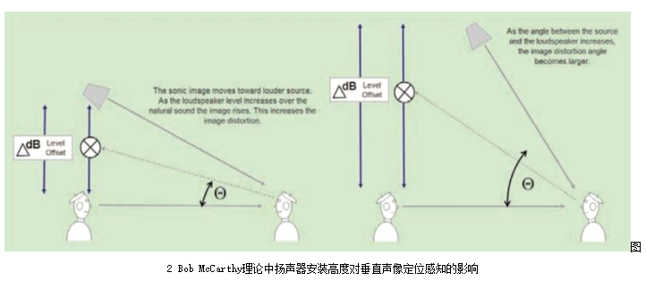 任何解決方案都存在一定的局限性。這些局限性主要來自于劇場的尺寸、舞臺的結構、觀眾席座位的分布以及劇場的聲學環境等要素。使用中置揚聲器對于那些舞臺鏡框特別高的場地可能不是一個好的選擇。吊掛的高度決定了聲源發出的位置(見圖2),若揚聲器與觀眾席垂直方向的夾角大于30°,位于前排的觀眾就有可能會感覺到垂直方向上的聲像漂移,產生人聲或對白來自頭頂而非前方的感覺。此時,設計時可以考慮通過臺唇補聲系統來覆蓋前排觀眾席,中置系統從3排或4排之后的區域開始覆蓋。